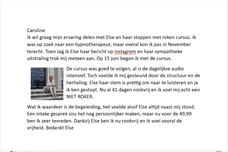 De dagelijkse audio en motivatie-oefeningen hielden me scherp, vooral in de eerste week, die voor mij het zwaarst was. Ik voelde een grote steun door de bereidheid van Else om vragen te beantwoorden. Het gaf mij het gevoel dat ik er niet alleen voor stond.